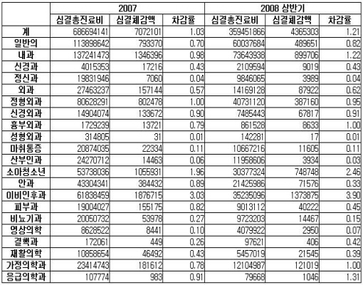▲ 2007~2008년 상반기, 의원급 의료기관 차등수가제 적용 현황(단위: 만원, %) 복지부, "적정진료 위해 제도 유지하되 기준 개선 검토" 보건복지가족부가 진료과목별 적정 환자수 등을 반영, 차등수가제 기준을 차별화하는 방안을 검토하기로 했다. 복지부는 4일 국회 보건복지위원회 심재철(한나라당)의원실에 제출한 서면답변서를 통해 "진료과목별 적정 환자수 기준이 다를 수 있으므로, 진료과목간 차별화된 보완 방안을 마련하는 등 기준 개선을 검토하겠다"고 밝혔다. 이에 앞서 한나라당 심재철 의원은 지난 복지부 국정감사에서 "차등수가제가 보험재정 절감을 위한 불필요한 규제로 전락했다"고 지적하면서 이에 대한 전면 재검토를 주문한 바 있다. 당시 복지부 전재희 장관은 "국민에게 적정한 진료서비스를 제공하기 위해서는 차등수가제도자체의 유지는 필요하다"면서 제도의 전면 폐지는 불가하다는 입장을 밝히면서 기준 개선방안을 검토하겠다고 밝혔었다. 복지부는 이날 서면답변을 통해 차등수가제의 폐지는 불가하는 입장을 다시한번 강조하면서도, 기준개선에 대해 보다 구체적인 안을 내놨다. 과목별 적정인원에 대한 고려없이 모든 표시과목에 동일한 기준을 적용하는 것은 현실적으로 무리가 있을 수 있을 수 있다고 보고, 과목별로 차등화된 기준을 설정하는 방안을 고려하겠다고 밝힌 것. 이 경우 환자가 많이 몰리는 과목은 차등수가 기준을 상향조정하고, 그렇지 않은 과목은 현재보다 기준을 낮추는 방향으로 조정하는 방안 등이 고려될 것으로 보인다. 차등수가 삭감 상반기 436억원…ENT·소청과 조정률 높아 한편, 차등수가 적용으로 인해 의원급 의료기관에서 조정되는 급여비는 연 평균 전체 진료비의 1.1% 수준인 것으로 집계됐다. 실 진료비 체감액은 2007년 707억원, 올해 상반기 436억원 규모. 특히 과목별로는 이비인후과와 소아청소년과, 내과 등에서 조정률이 평균보다 높았다. 실제 건강보험심사평가원에 따르면 올해 상반기 기준, 의원급 의료기관의 심결총진료비는 3조5945억원이며 이 가운데 1.21%인 436억5303만원이 차등수가제 적용으로 차감됐다. 과목별 차감률(심결체감액/심결총진료비)은 이비인후과가 3.90%로 가장 높았으며 소아청소년과 2.46%, 내과가 1.22% 등으로 평균을 웃돌았다. 과목별 차감률이 높다는 것은 진료비 중 차등수가제 적용으로 조정된 금액이 많다는 것으로, 일 평균 75명의 이상의 환자를 보는 경우가 상대적으로 많다는 의미다. 반면 산부인과와 비뇨기과는 차등수가제로 인한 차감률이 각각 0.01%, 0. 15%에 그쳐, 상대적으로 차등수가 기준을 넘겨 진료하는 경우가 드문 것으로 나타났다. 출처:메디게이트뉴스(고신정기자) |