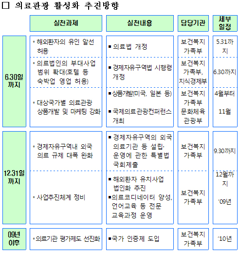 정부, 의료산업화 계획 확정…외국 의약사 취업문호 개방 앞으로 병원급 이상 의료기관에서 한의원을 별도 개설, 양·한방 협진서비스를 제공할 수 있게 된다. 또한 외국 의·약사가 국내 경제특구 외국병원에 취업할 수 있는 길이 열린다. 정부는 28일 대통령 주재 민관합동 경제활성화 회의에서 서비스 산업 선진화 방안(Service-Progress I)을 통해 의료관광 등 의료산업화 추진계획을 확정했다. ◆의료기관 규제 완화 = 국내 의료기관의 규제가 대폭 완화된다. 양·한방 복수면허자가 의원급 의료기관 개설시 면허범위 내에서 의료행위가 허용된다. 병원급 이상 의료기관에서 양·한방 진료를 동시에 받을 수 있도록 협진체계도 구축된다. 즉 산부인과 병원 내에 한의원을 별도 개설해 한방진료서비스를 제공할 수 있다는 이야기다. 또한 의료법인이 수행할 수 있는 부대사업 범위를 대통령으로 위임해 부대사업 범위를 확대하고 의료기관 합병에 관한 법적 근거와 절차를 마련, 의료법인의 퇴출구조 마련 및 경영합리화 유도 방안도 마련된다. 기존 100병상인 종합병원 병상기준을 300병상으로 상향 조정하고 특화병원과 취약지역 거점병원을 지정할 수 있도록 특수 기능병원 제도도 도입된다. 정부는 이를 위해 의료법 전면 개정안을 4월 임시국회에서 처리토록 하고 입법이 되지 않은 사안은 6월 이후 신속한 재입법 절차를 통해 의료기관 규제완화를 지속 추진키로 했다. ◆경제자유구역내 외국의료 규제 완화 = 외국의 의사, 치과의사, 약사, 간호사 등이 외국의료기관에서 근무할 수 있다. 아울러 외국 의료기관에서 종사하는 의사는 외국의 의사에게 원격 의료지원을 받을 수 있도록 제도가 정비된다. 의료법인의 부대사업 범위를 확대해 호텔 등 숙박업 영업도 허용된다. ◆해외 환자 유치를 위한 제도개선 = 환자 및 동반가족에게 기타(G-1) 비자를 발급해 입국후 치료완료시까지 국내에 체류할 수 있도록 비자제도가 간소화 된다. 비자 신청 첨부서류도 최소화 된다. 기존 병원영업허가서 등 6종의 첨부서류가 의사 소견서 등 3종으로 축소된다. 정부는 또한 해외환자를 대상으로 유인·알선을 허용하는 방안도 4월 임시국회서 처리키로 했다. 또한 현지 에이전시·보험사와 국내 의료기관간 파트너십을 통해 대상 국가별로 특화된 의료관광 상품도 개발된다. 해외환자 유치사업을 수행하는 한국국제의료서비스협의회의 법인화도 추진된다. 출처:데일리팜 (강신국 기자)